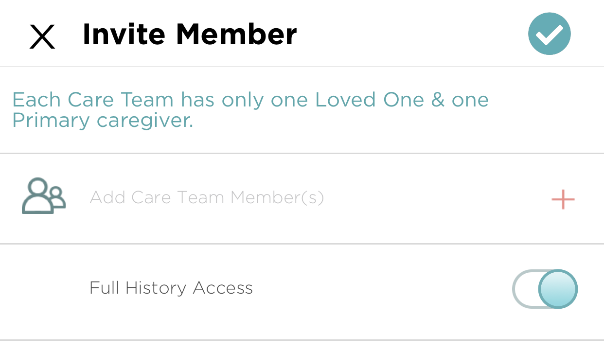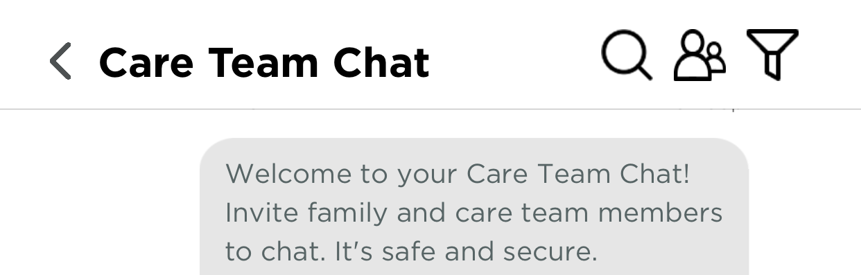 1 . To invite someone (family, friend, doctor, nurse, etc.) to an individual Log (e.g., Care Tasks Log, Care Team Chat, etc.), tap the “Team” icon in the upper right (between the Search and Filter icons).